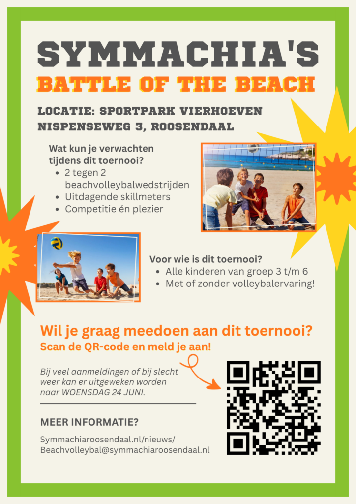 Binnenkort is het zover: The Battle of the Beach bij De Moriaan Symmachia Roosendaal. Dit stoere beachvolleybaltoernooi is speciaal voor de groepen 3 t/m 6 van de basisschool en vindt plaats op woensdagmiddag 17 juni op onze Beach Arena op Sportpark Vierhoeven in Roosendaal. Het toernooi begint om 15.00 uur en eindigt om 17.30 uur.